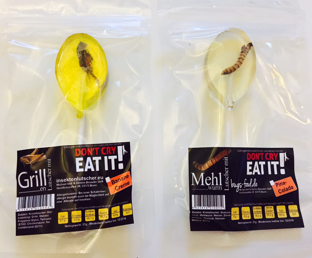 Heute verlosen wir mal was „ganz besonderes“ đ Und zwar einen dicken Lolli mit einem noch dickeren Mehlwurm darin und einen mit einer echten Grille als FĂŒllung.