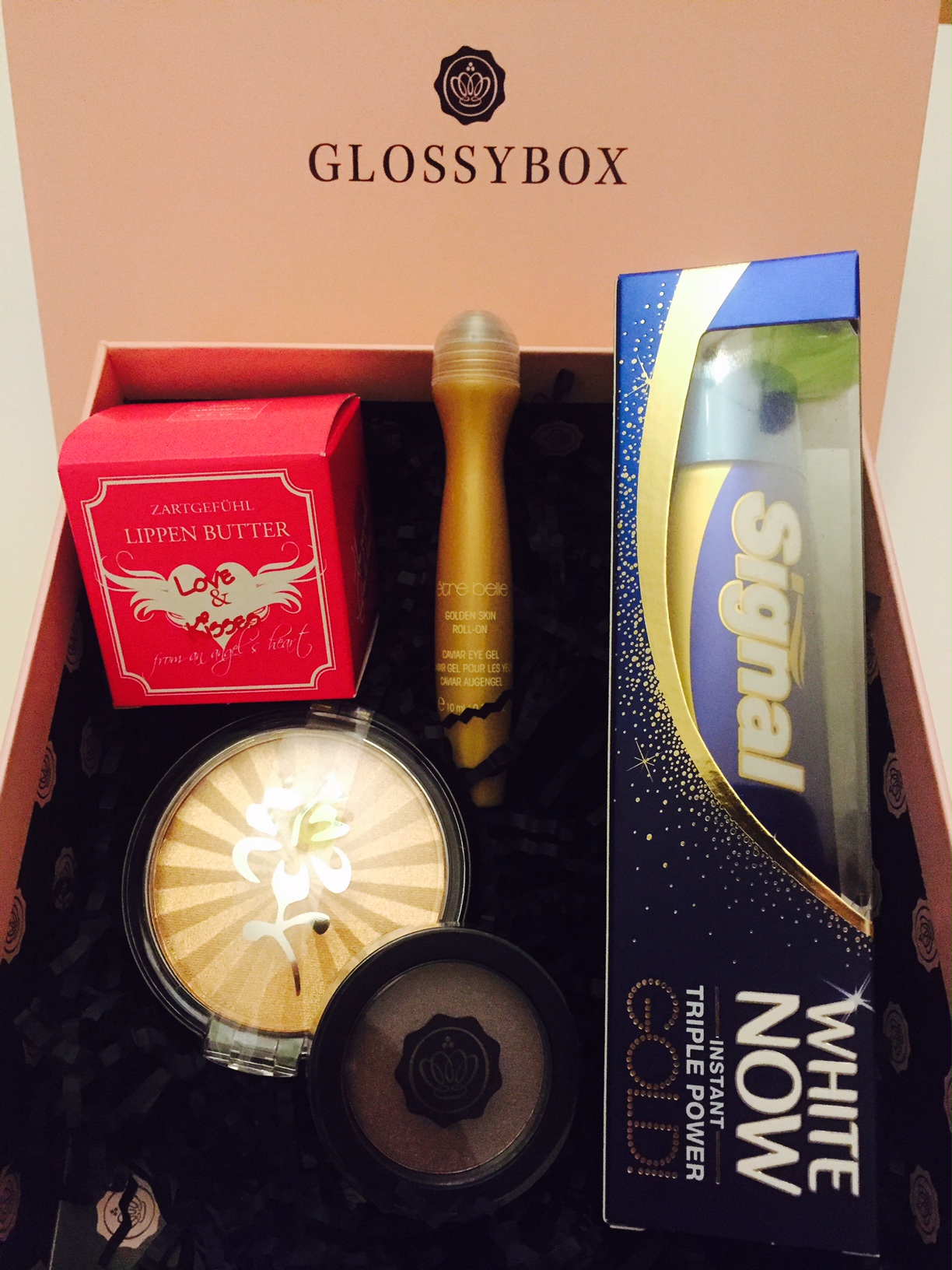 Für strahlend weiße Beißerchen hat Glossybox die neue Zahncreme von Signal in die Box gepackt. Dies fanden die Glossybox-Abonnentinnen aber nicht so prickelnd und haben sich bei Facebook massenhaft über dieses Produkt in der Box beschwert. ? Ich finde Zahnpasta auch nicht besonders glamourös und habe auch schon oft gemeckert, dass solche Produkte nichts in einer Glossybox zu suchen haben. Dennoch finde ich es dieses Mal ok. Das Produkt trägt den Titel “Gold” und passt somit zumindest dem Namen nach in die Box. Klar mit den Goldenen 20ern hat das nicht wirklich viel zu tun aber wenigstens ist die Zahnpasta nützlich und ich wollte diese neue zahnaufhellende Zahnpasta eh schon länger ausprobieren. ?